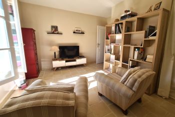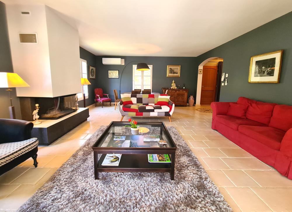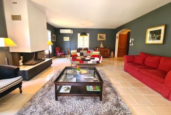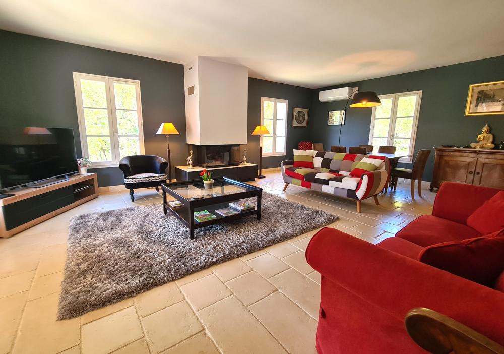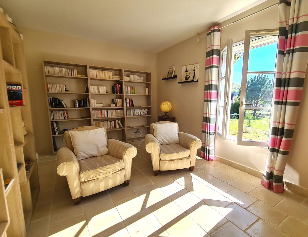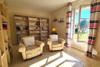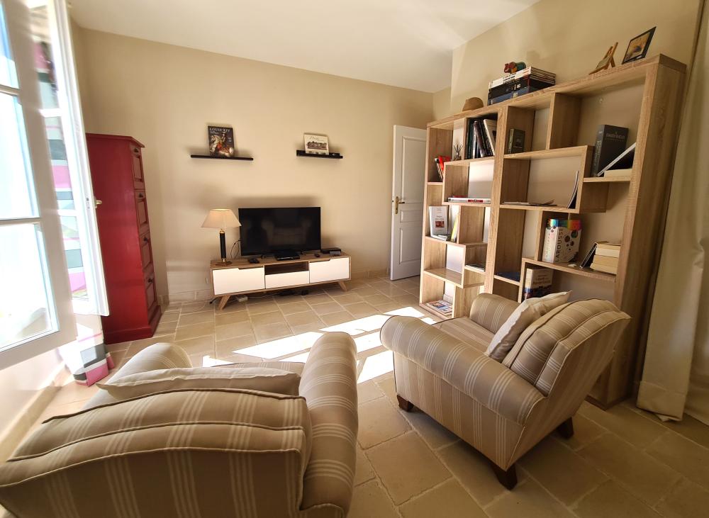 - a comfortable sitting area with two sofas and armchair, coffee table, lamps and smart TV. French doors opening onto the terrace and pool area.