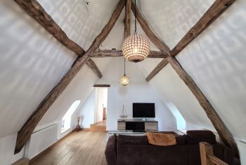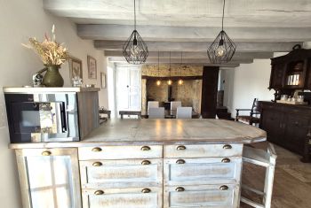 Situated at just 10m from the main house, the guest house offers a fabulous spacious living room with a leather chesterfield sofa and two armchairs set around the woodburner and flat screen TV. A large solid wooden dining table offers the possibility for 11 people to eat inside during wet weather or the low season.