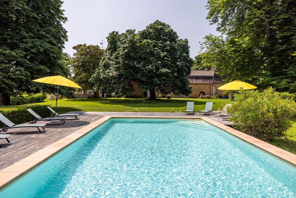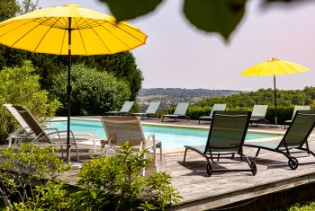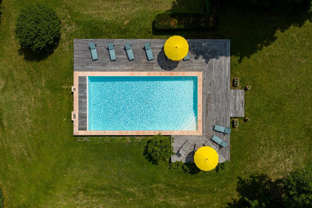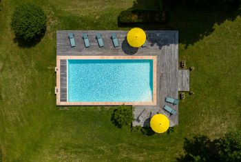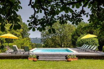 * The terrace overlooking the Dordogne was chosen to host a new built pool (12x6,5 meters - salt filtre - electric cover and pool alarm) with a large paved decking. It is equiped with sunbeds and parasols