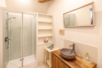 * The bedroom "Coteaux" (hills) (15m²) with a very large 180×200, (can be made as a twin bedroom), shower room and toilet.