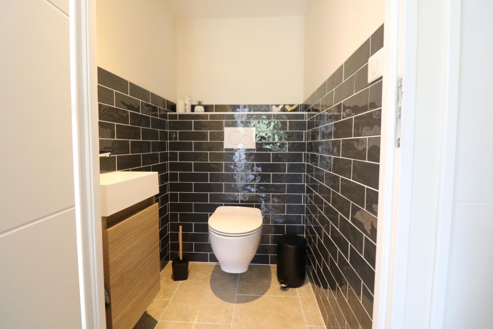 * Adjoining, the firstAttached, the first fully tiled bathroom offers an XL walk-in shower, vanity and towel dryer.