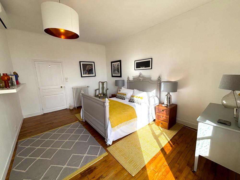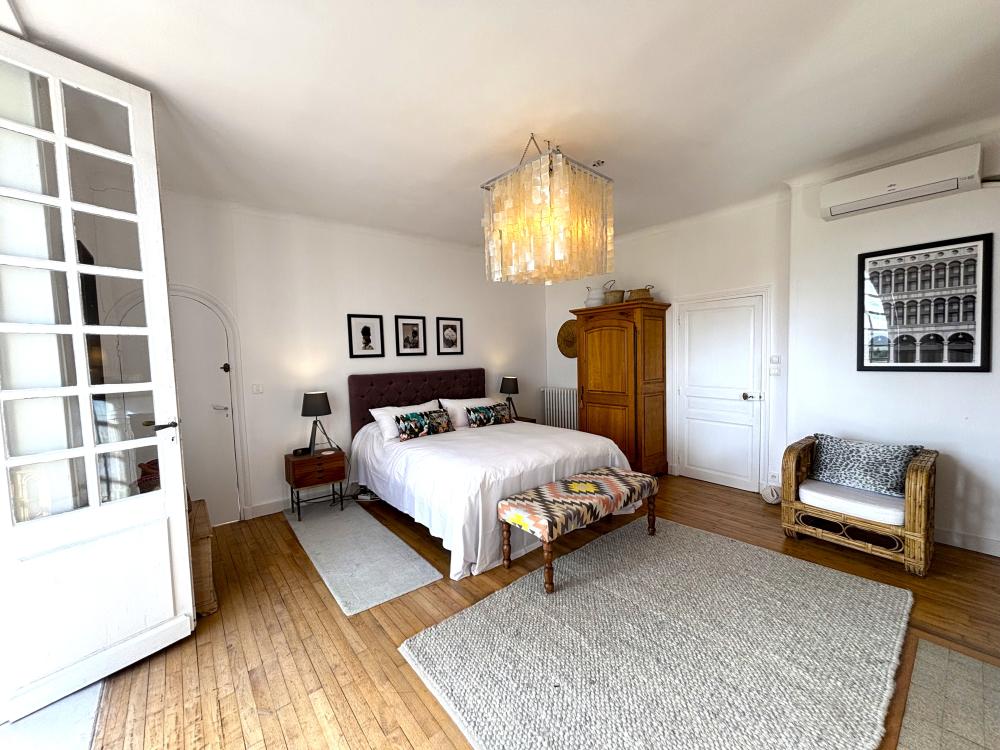 - The large master bedroom, furnished with a king-size double bed (180cm large), bed side tables, a wooden wardrobe, two built-in wardrobe, and two armchairs. It enjoys air-conditioning, french doors to balcony and a ensuite bathroom with a beautiful bathtub, a shower and toilet.