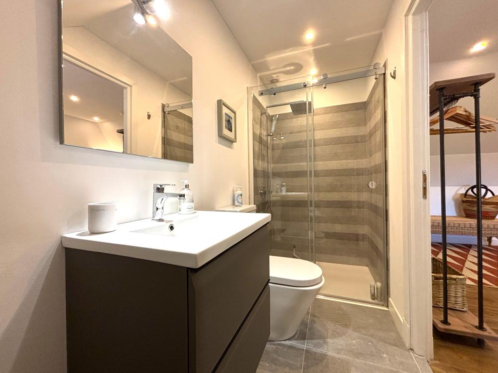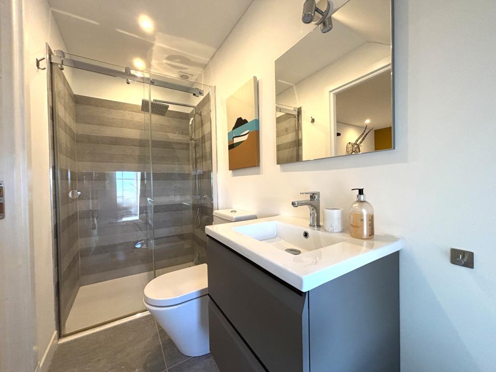 The three bedrooms at first flloor enjoy each an ensuite shower room, with a walk in shower, washbasin and toilet, and a mobile air-conditioning unit.