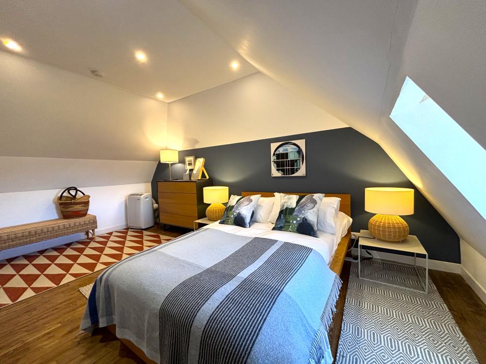 It has a large double bed (160cm large), two bedside tables and a wardrobe, a sitting area with a sofa and coffee table. Its ensuite shower room enjoys a walk in shower, washbasin and toilet.