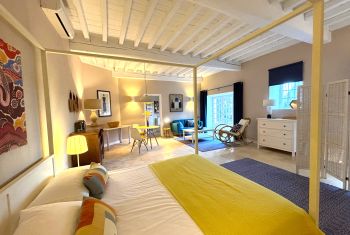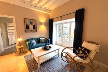 - The elegant sitting room is bathed in light with its two french doors leading to the balcony with a round table and chairs : such an incredible place from which to contemplate the view.