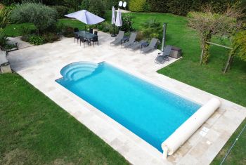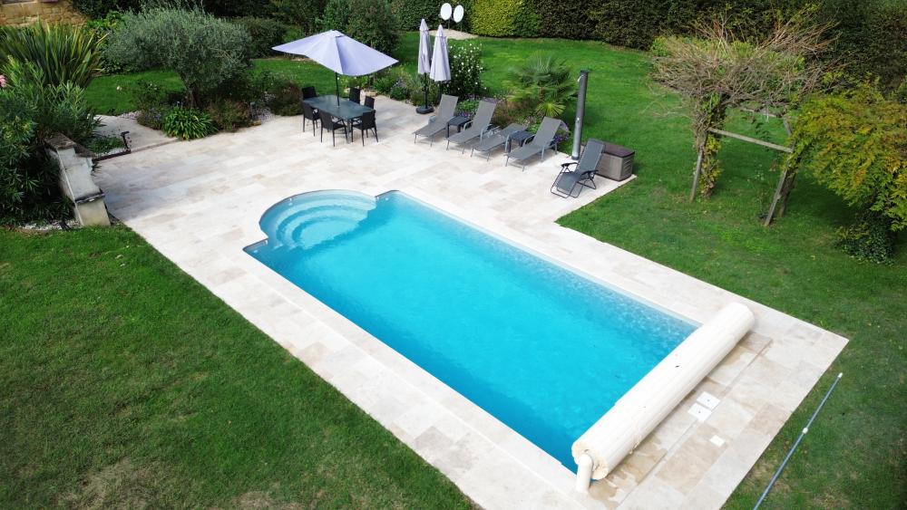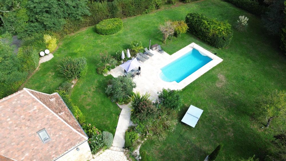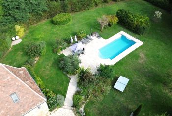 * the private pool, heated from May to September, measures 10m x 5m, and has a shallow end of approximately 1m20, and a deep end of 2m. It is secured by a floating hard cover. A barbecue, table and chairs, sun loungers and parasols are set on the terrace surrounding the pool.