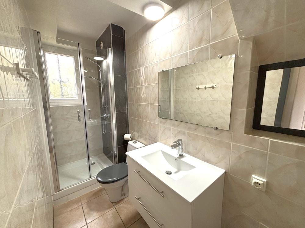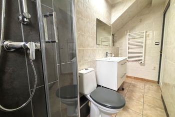 - a shower room with handbasin unit, towel rail and toilet.