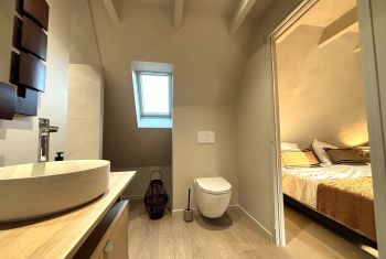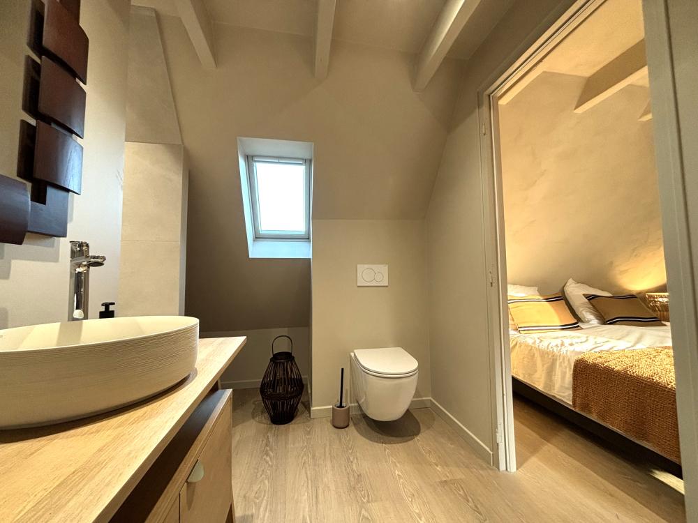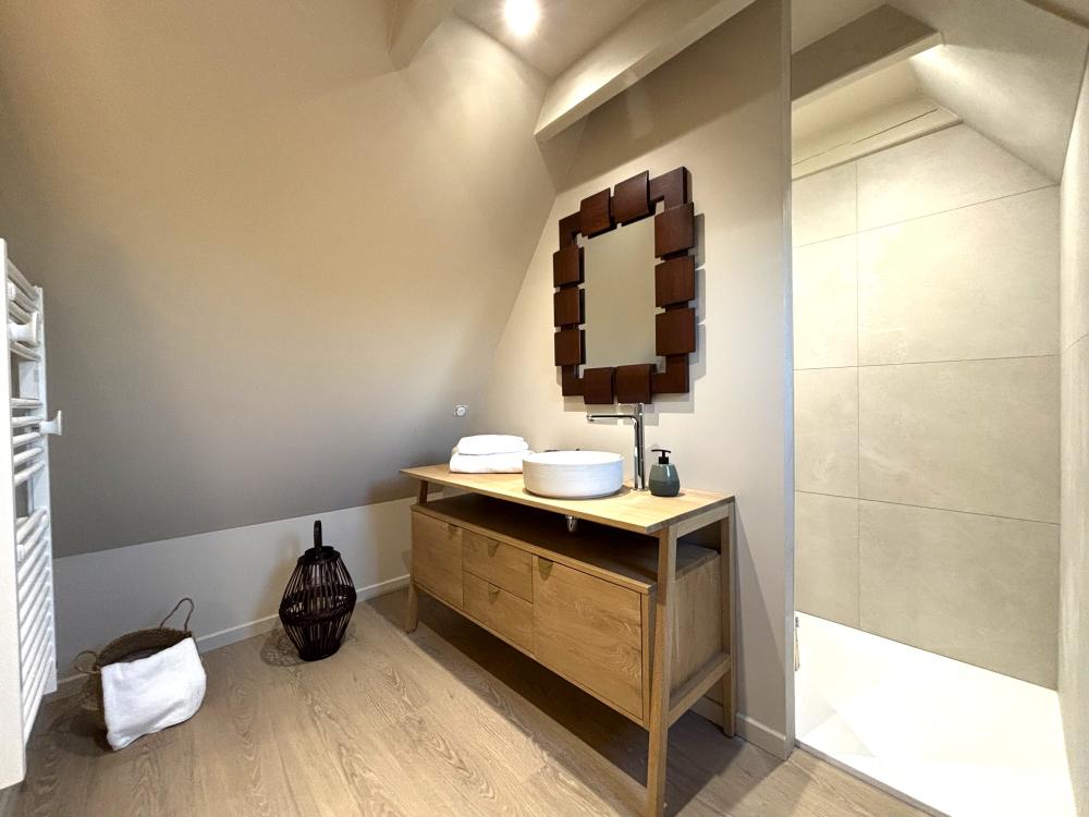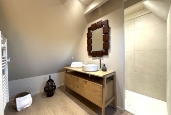 * A beautiful wooden staircase finally leads to the fourth and last double bedroom, LA DONZELLE, located at the bottom of the property. It is elegantly furnished with a large double bed 180cm wide, two bedside tables, a wardrobe and an armchair. It also has from its bathroom then with tiled shower, double vaque cabinet and separate toilet.